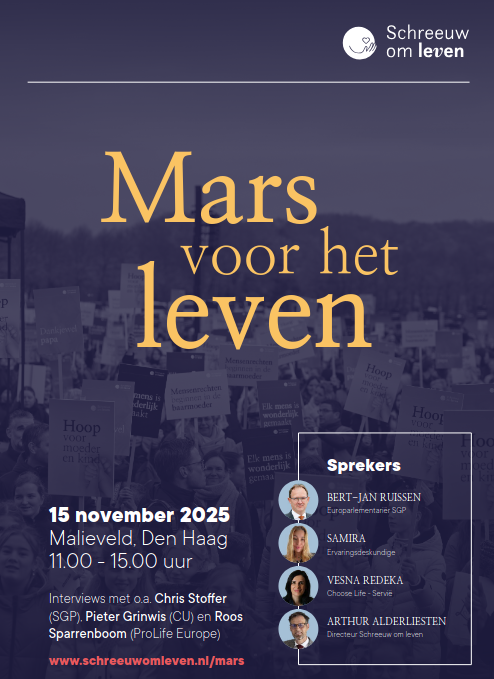 Op zaterdag 15 november vindt opnieuw de Mars van het Leven plaats op het Malieveld in Den Haag, met aanvang om 11.00 uur. Ook dit jaar willen we als christelijke gemeenschap onze stem laten horen voor het kostbare geschenk van het leven – vanaf het prilste begin tot aan het einde.