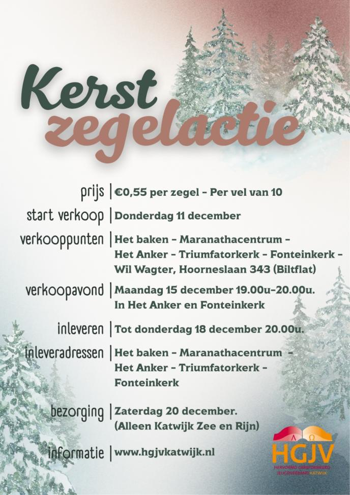De speciale verkoopavond is gepland op maandag 15 december van 19.00 tot 20.00 uur in Het Anker en de Fonteinkerk. De prijs van de zegels is zeker niet hoog te noemen. Voor maar € 5,50 koopt u een vel met 10 HGJV – Kerstzegels. De opbrengst van de kerstzegelactie komt ten goede aan het HGJV. De kerstkaarten kunnen tot donderdag 18 december voor 20.00 uur ingeleverd worden op de volgende adressen: Het Anker, Het Baken, Maranathacentrum, Triumfatorkerk en Fonteinkerk.