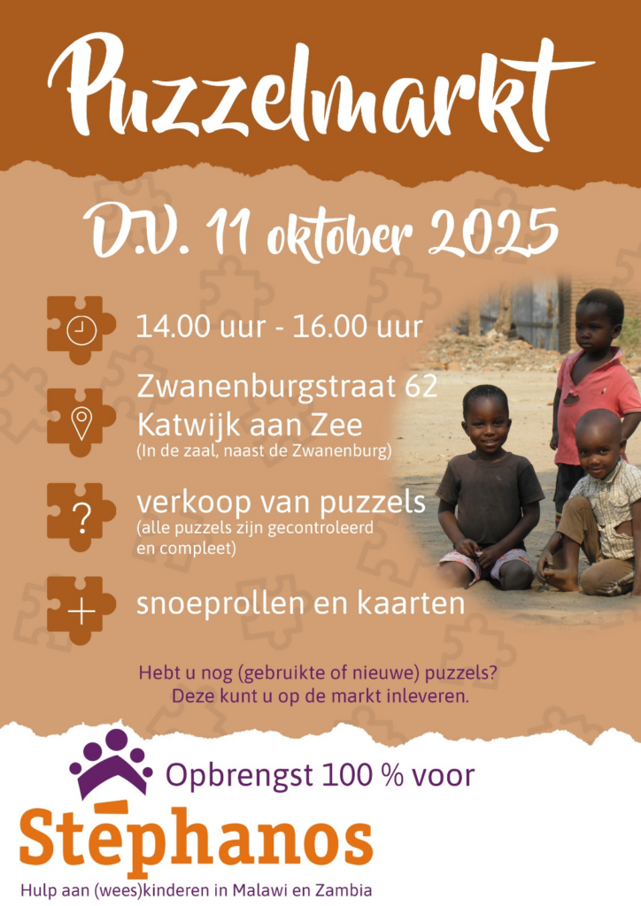Er is keuze uit ruim 500 puzzels van diverse merken. O.a. Jan van Haasteren, Falcon, Gibsons, WasGij, Ravensburger, kinderpuzzels enz. Van 10 tot 3.000 stukjes, we hebben het allemaal! Alle puzzels zijn compleet! De volledige opbrengst is voor (wees)kinderen in Zambia en Malawi. Meer informatie kunt u vinden op www.stephanoskatwijk.nl/puzzelmarkt. U heeft deze middag ook de gelegenheid om uw puzzels in te leveren.