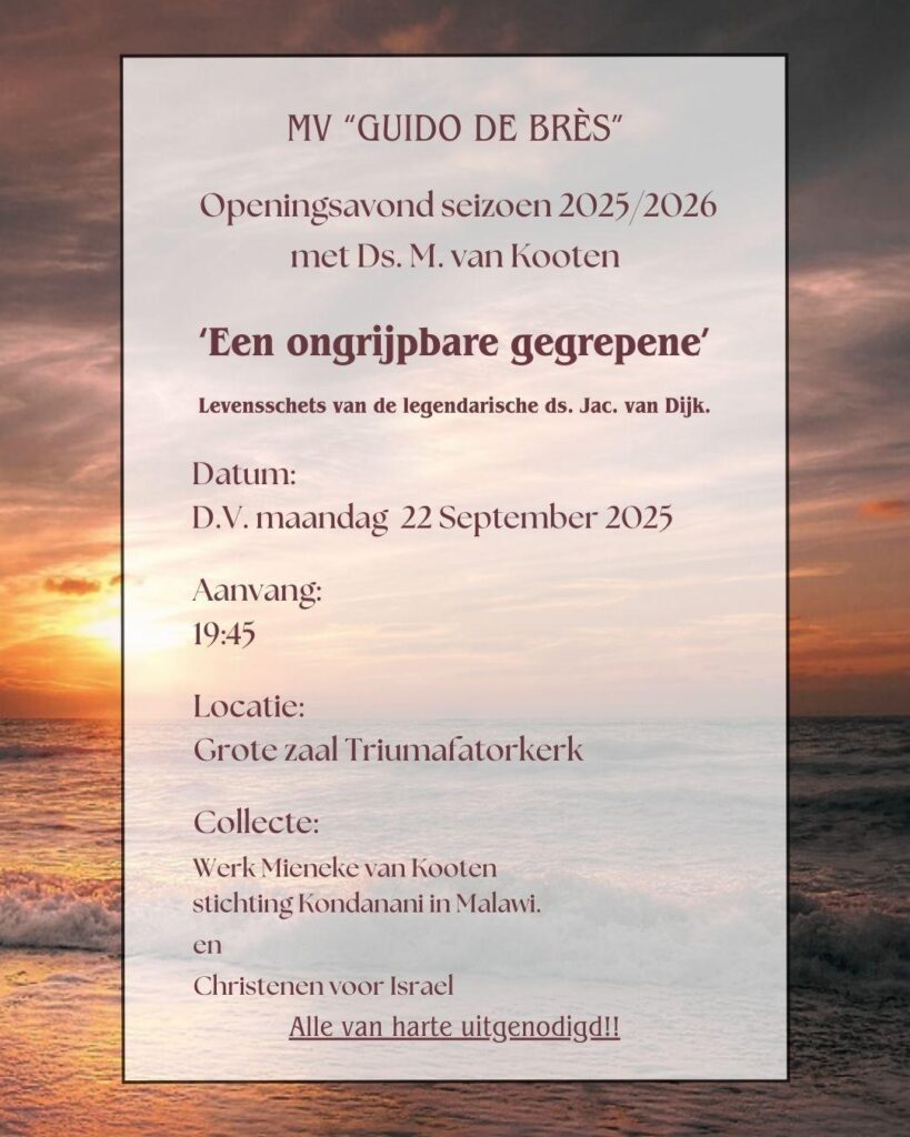 Het onderwerp voor deze avond is “Een ongrijpbare gegrepene”, levensschets van ds. Jac. van Dijk. Ds. M. van Kooten hoopt daarover te vertellen. Deze avond begint om 19.45 uur in de zaal van de Triumfatorkerk.